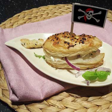 Wir sind auf See und das spiegelt sich auch in unseren Rezepten wieder. Alles dreht sich ums Wasser und so dürfen Schiffchen nicht fehlen. Unsere sind lecker gefüllt mit Schafskäse und geschmückt mit der Totenkopf-Flagge der Piraten. Fisch und Meeresfrüchte stehen ganz vorne auf der Speisefolge. Für à la minute gebeizten Lachs würde jeder echte Räuber der Meere töten. Und dabei ist er ganz einfach zuzubereiten. Rustikal geht es mit den Fleischbällchen und dem Stockbrot weiter. Man kann schon das Lagerfeuer am Strand knistern hören an dem üblicherweise sonst das Stockbrot geröstet wird. Hier mal im Miniformat auf kleinen Holzspießen und genauso lecker. Zum Schluss entern wir die Bounty! Ein unglaublich schokoladiger Kuchen aus dem Glas, der keine Wünsche mehr übrig lässt.
