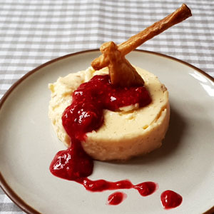 Echtes Försterfeeling kommt auf mit einem herzhaften Ragout vom heimischen Wildschwein und fruchtiger Preiselbeer Sauce. Der Überraschungsgast in unserem Menü ist der bekannt-beliebte Kaiserschmarrn in einer herzhaften Variante mit Rosmarin. Zum Abschluss füllen wir die verlorenen Kalorien mit einer sahnigen bayrischen Creme auf. Lasst Euch nicht von der blutigen Axt abschrecken, das ist nur Himbeersauce mit Blätterteig.