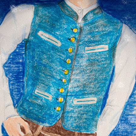 Der Hüttenwirt hat eine Krachlederne an. Is halt praktisch, gell. Aber wegen Weihnachten hat er obenrum schicksalsergeben eine fesche Trachtenwesten mit weißen Hemden angezogen.