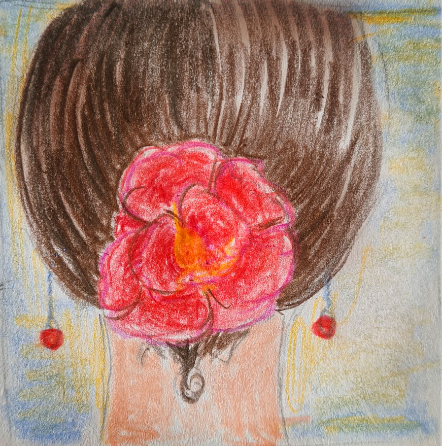 Die junge Schneiderin arbeitet steil an ihrer Karriere in der Modebranche. Deshalb hat sie immer Maßband, Stecknadeln und Schere dabei: man weiß ja nie, wann ein neuer Kunde kommt!