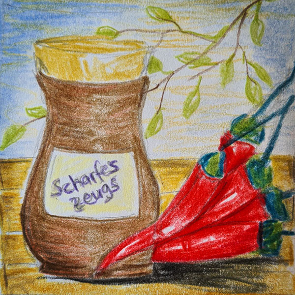 Der Gewürzhändler trägt immer ein paar Kostproben seiner herrlichen Gewürze: Ein paar scharfe Peperoni, ein Gläschen Nelken, … Man weiß ja nie, ob jemand Interesse hat.