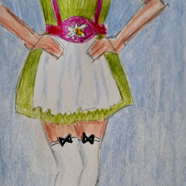 Das Topmodel ist natürlich mit echter Designerware bekleidet: Ihr Lieblingsdesigner Richií hat ihr das knappe Dirndl geradezu auf den Leib geschneidert. Das muss man tragen können!