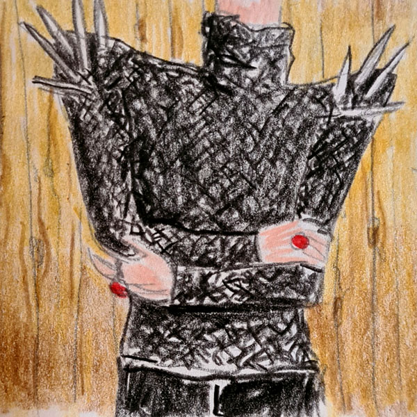 Der schillernde Modezar aus Schwabing trägt natürlich auch eine eigene Kreation aus der neuen Kollektion. Ein schwarzer Strickpulli und der Clou: Die Stricknadeln stecken noch drin!