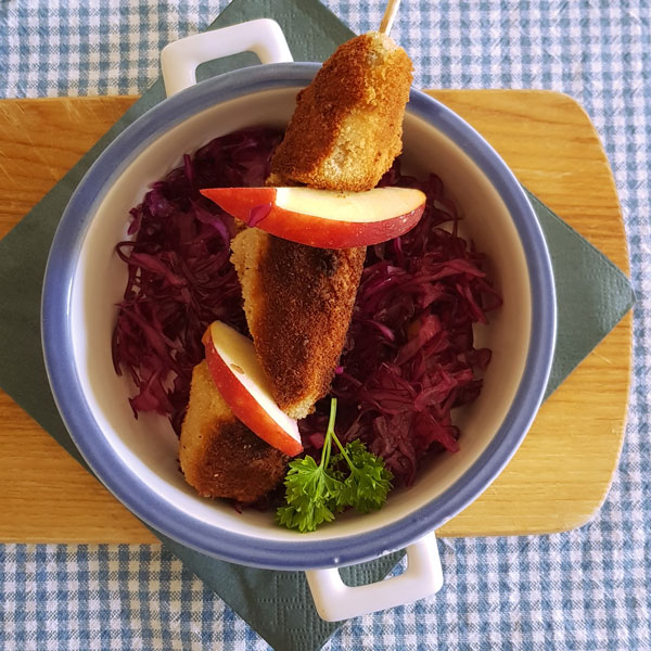 - Gebackene Weißwurst auf Blaukrautsalat